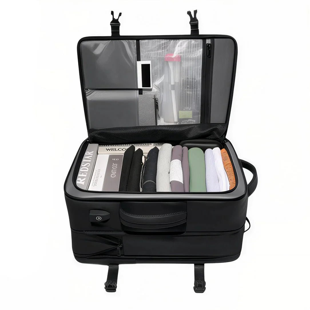 Avec ses dimensions conçues pour passer en cabine (même compagnies low-cost), ce sac de 30L vous permet d’éviter les frais de bagages en soute. Sa capacité extensible offre une marge de rangement idéale pour vêtements, accessoires et objets tech. Léger et compact, il se glisse facilement dans les compartiments à bagages ou sous le siège.